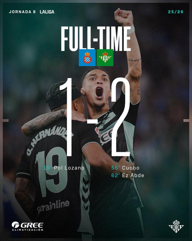 雷速体育10月6日讯 由于普阿多读秒点球罚丢,贝蒂斯最终在客场2-1顽强逆转西班牙人,豪取西甲三连胜。